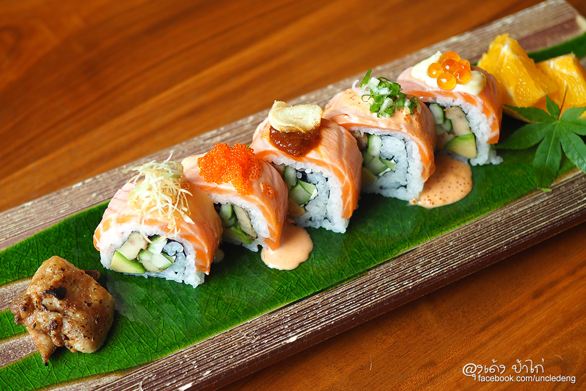 โรลระดับพรีเมี่ยม อัดแน่นด้วยตับห่าน ดโวคาโด ชีส พร้อมด้วยแซลมอน โดดเด่นด้วยซอส 5 ชนิด นั้นหมายความว่า แต่ละคำ รสชาติจะแตกต่างกัน เป็นเมนูที่กินแล้วสนุกมาก