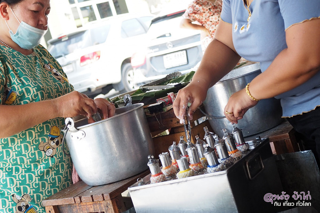 ร้านนี้ลูกค้าวนเวียนเข้ามาซื้อกันตลอดทั้งวันนะครับ เรียกว่า แม่ค้าจับแป้งหยอดใสกระบอกตลอดเวลาเลยล่ะ ... 6 ชิ้น 20 บาท อะไรจะถูกปานนี้