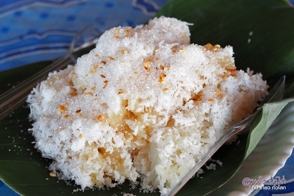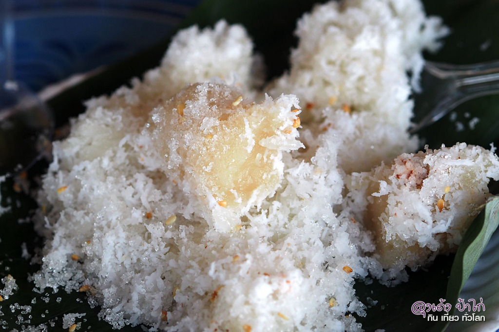 และนี่คือ ขนมบอกตัวแป้งเมื่อนึ่งสุกแล้ว ก็จะมีความนุ่มๆ เหนียวๆ รสหวานนิดๆ จาก น้ำตาลโตนด เพิ่มความหอมด้วยมะพร้าวขูด เติมความหวานด้วย น้ำตาลทรายกับงาคั่ว