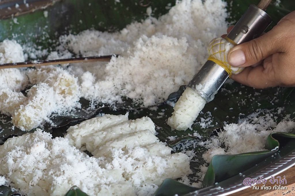 นี่คือ เหนียวบอก คือนำข้าวเหนียวนึ่งสุก ใส่ในกระบอก แล้วน้ำไปนึ่งร้อน จากนั้น ก็ดันออกมา แล้วคลุกกับมะพร้าวขูด
