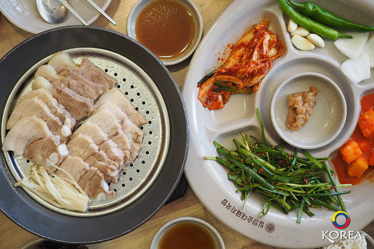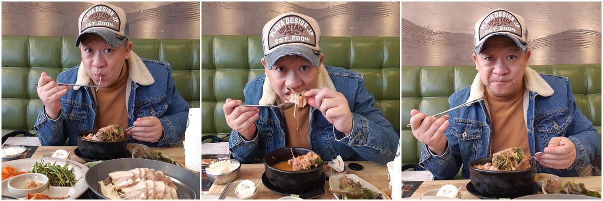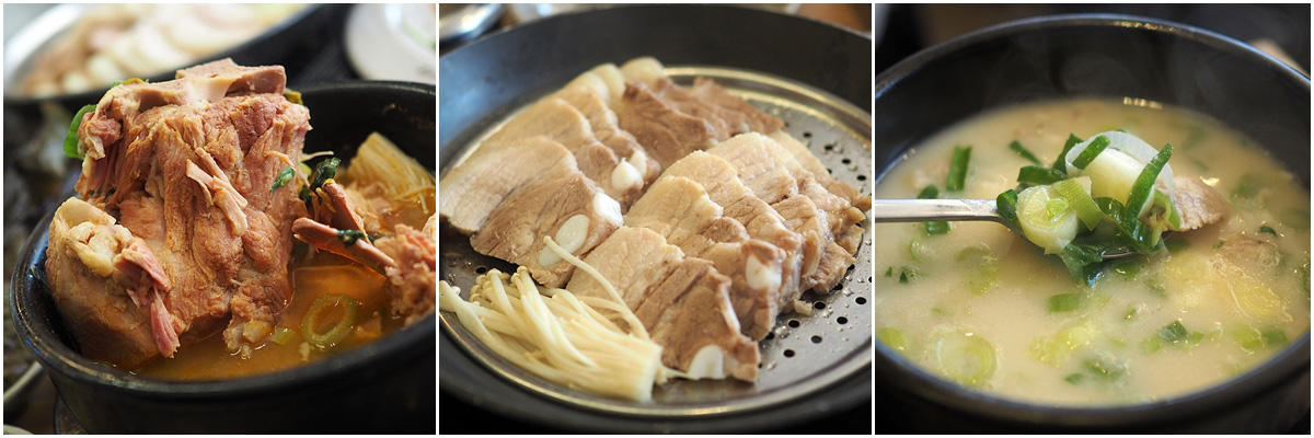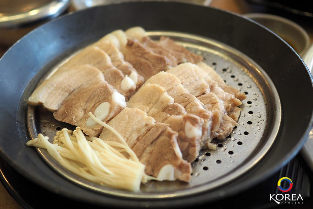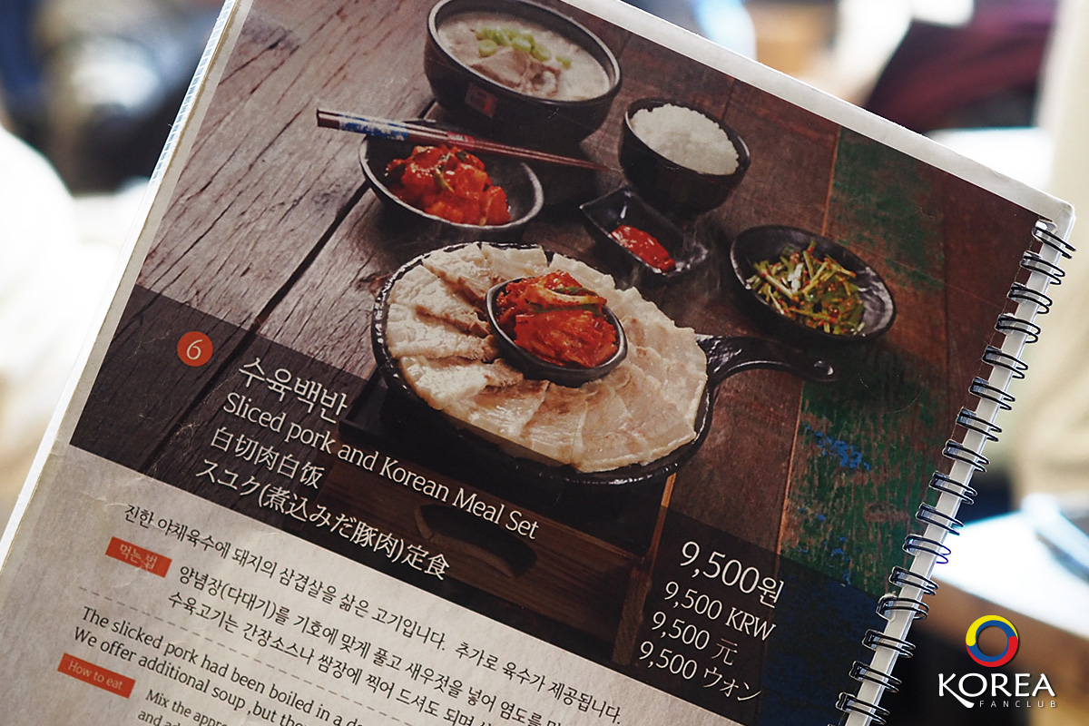 นี่คือเมนูที่ขายดีที่สุดของร้าน : Sliced pork and Korean Meal Set ราคา 9500 วอน ประกอบด้วย เนื้อหมูต้มสไตล์ 1 จาน + ซุปเนื้อหมู + ขาวสวย 1 ถ้วย (ชุดนี้กินได้ 2 คน)