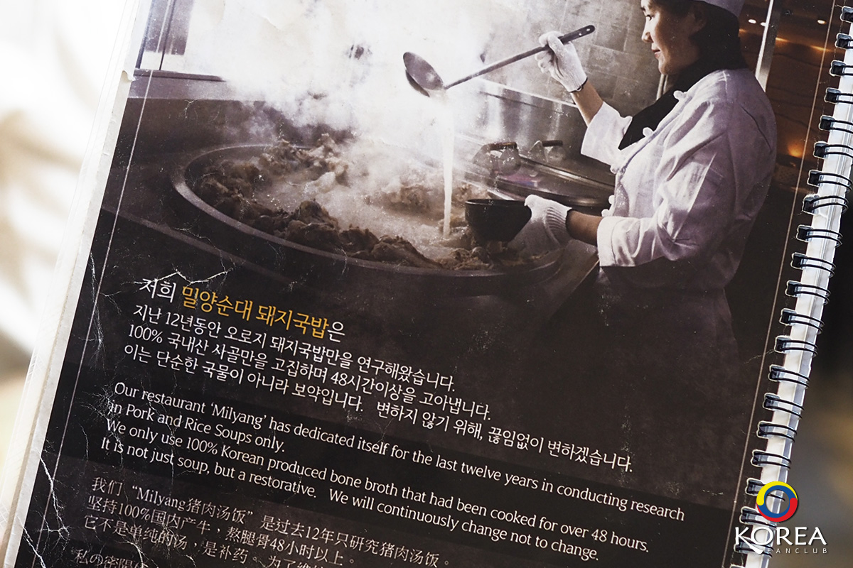 ร้าน Milyang Sundae Dwaeji Gukbap ให้บริการความอร่อยมานานกว่า 12 ปี ใช้วัตถุดิบอย่างดี น้ำซุปที่เสิร์ฟ ใช้เวลาเคี่ยวกระดูกหมูนานกว่า 48 ชั่วโมง จนได้น้ำซุปสีขาวเหมือนนม