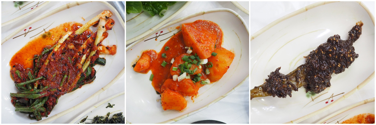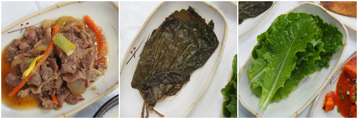 หมูผัดซอส ... ตักเพิ่มได้ไม่จำกัด - หมดก็เดินไปตักเองเลย (แต่ถ้า ตักมาแล้ว ต้องกินให้หมดนะ - คนเกาหลี เค้าไม่กินทิ้งกินขว้าง) ผักสดเกาหลี บอกเลยว่า สดทุกร้าน กรอบอร่อย กิมจิก็ดี - น้ำจิ้มอร่อยที่สุด ( ลองมาชิมดูเองครับ บรรยายไม่ได้ 555 ) ทุกอย่างที่เป็นเครื่องเคียง เพิ่มได้ครับ