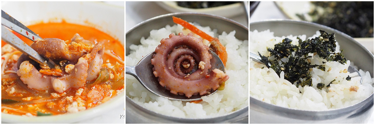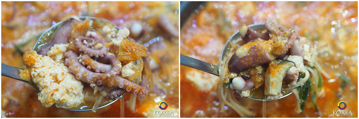 ขึ้นชื่อว่า หม้อไฟเกาหลี ก็ต้อง ใส่ของสด แล้ว ต้มให้สุก กินร้อนๆ ที่เห็นในช้อนคือ หนวดหมึก เต้าหู้นุ่มเหมือนไข่ วุ้นเส้นเกาหลี และผัก