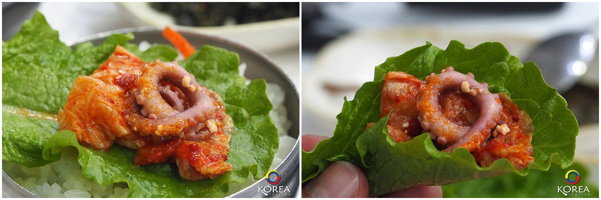 อาหารเกาหลี ต้องกินแบบนี้ด้วยครับ หมึกต้มสุก ใส่กิมจิ ห่อผักสด กินเป็นคำๆ อร่อยมากๆ