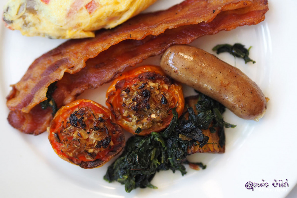ดุสิตธานี พัทยาอาหารเช้าแบบอเมริกัน ก็จัดมาครบ ไส้กรอก เบคอน ไข่ต่างๆ มะเขือเทศย่าง ผักโขม มันฝรั่ง