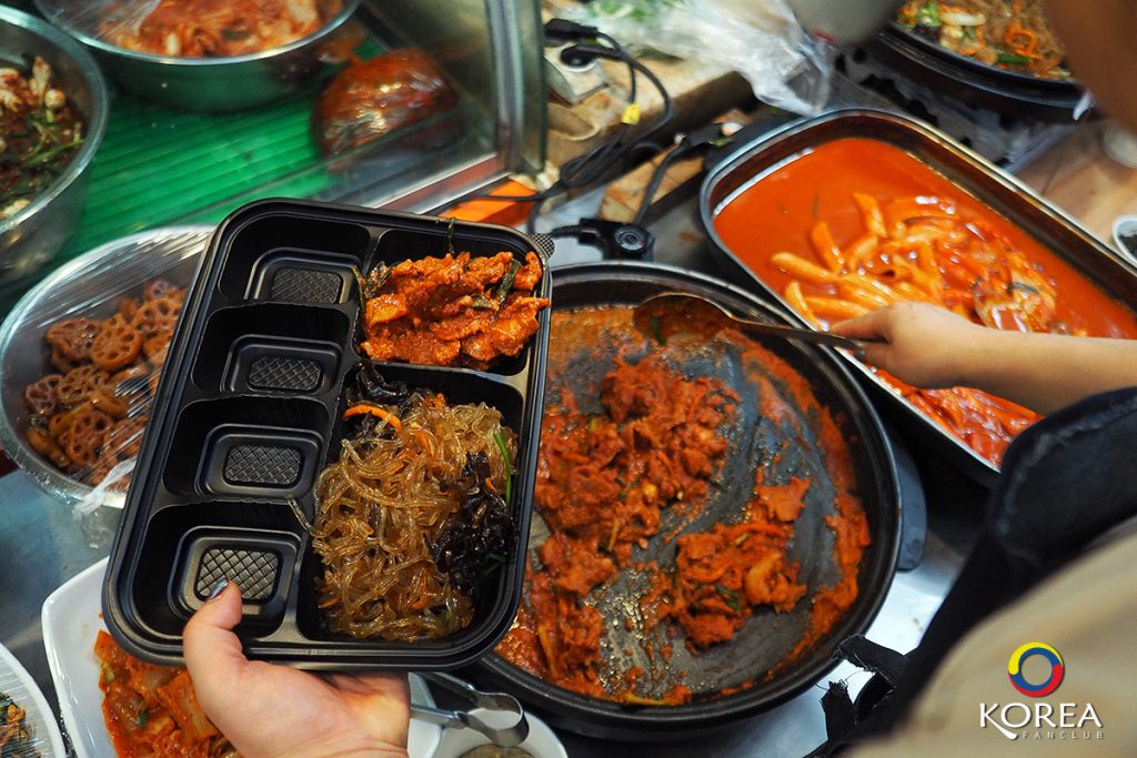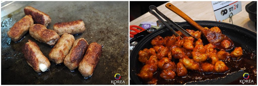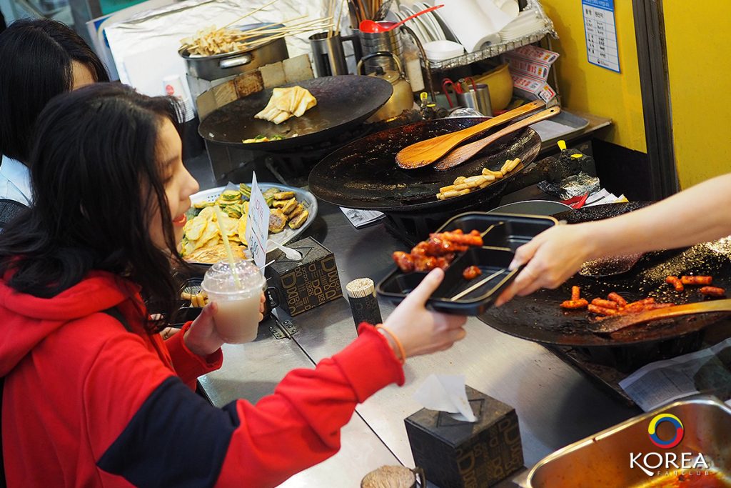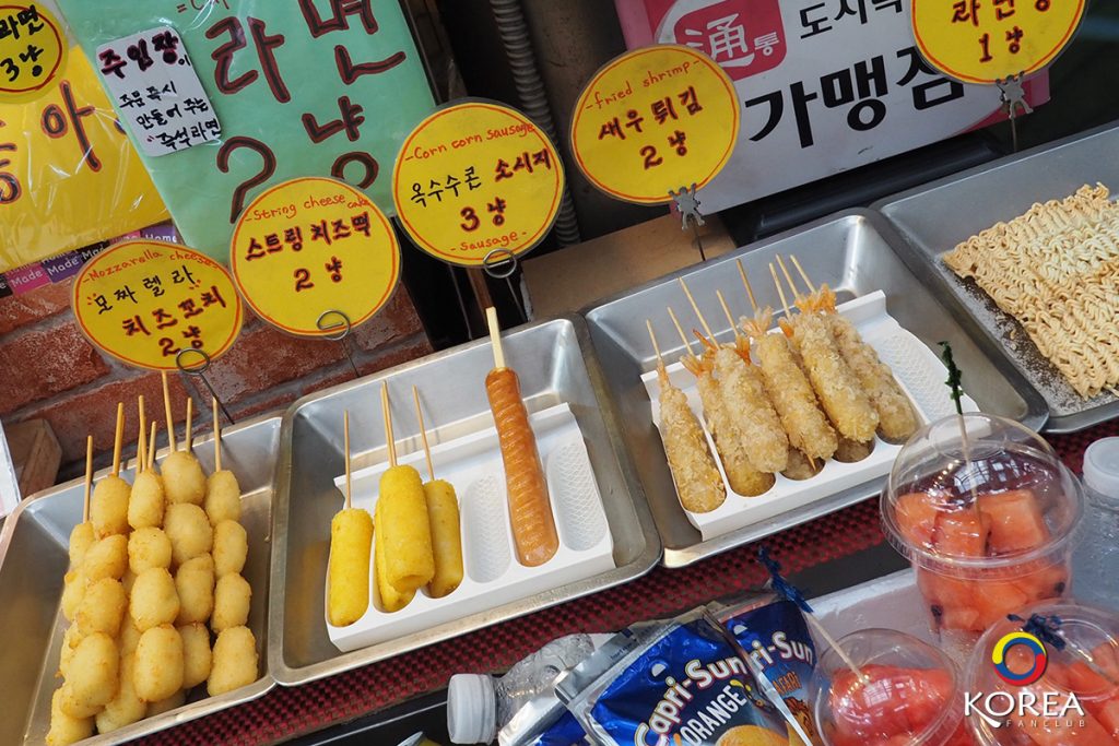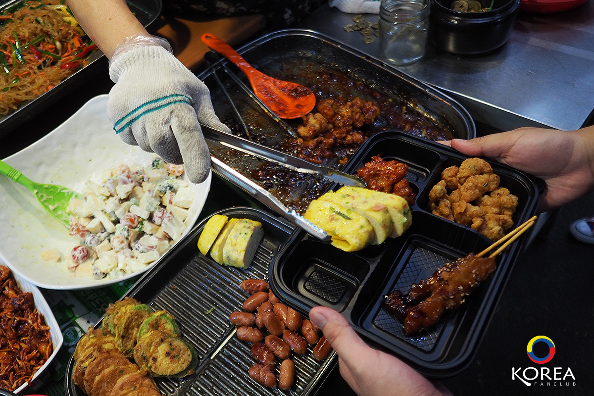 ส่วนมากจะเป็นอาหารพื้นเมือง กินง่าย ขายง่าย และเป็นที่นิยมของคนเกาหลี เช่น มันดู (เกี๊ยวเกาหลี) มีทั้งแบบทอด และแบบนึ่ง / ไข่ม้วนเกาหลี / ต๊อกโบกี / ต๊อกโบกีห่อเนื้อย่าง / คิบบับ หรือ ข้าวห่อสาหร่าย / พิซซ่าเกาหลี / ไก่ทอดซอสพริก / ผัดวุ้นเส้นเกาหลี / ต๊อกชุบแป้งทอด / โอเด้ง ออมุก อูด้ง และอื่นๆ อีกเพียบ