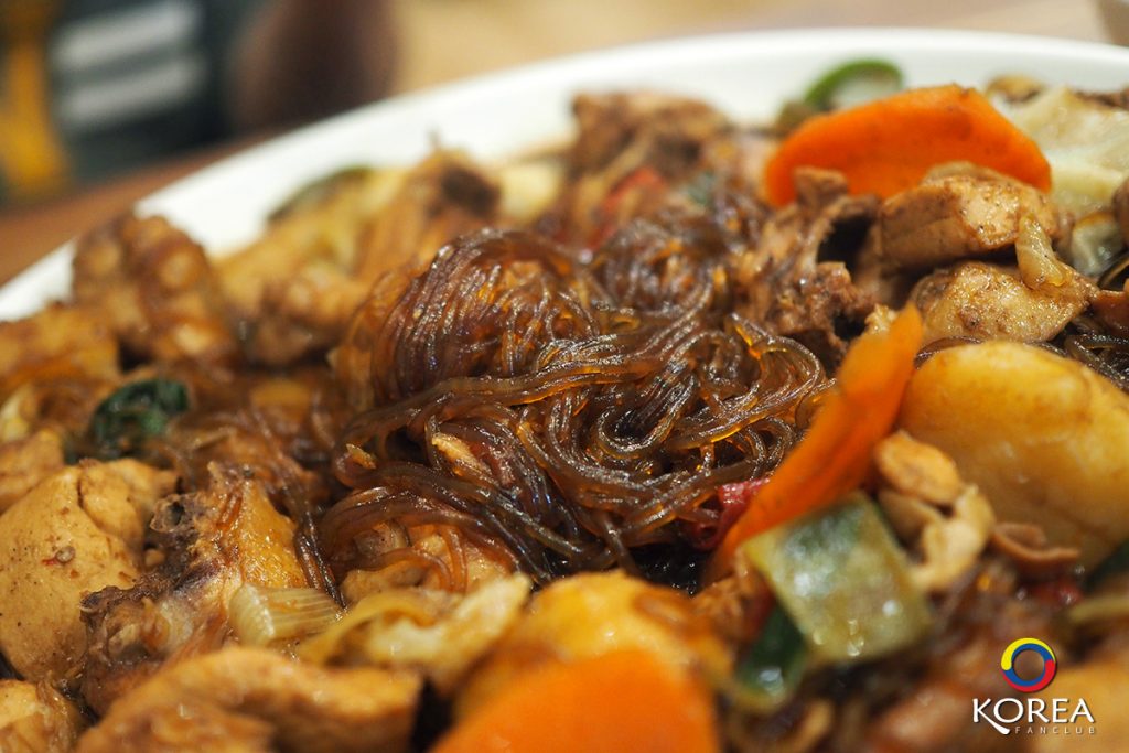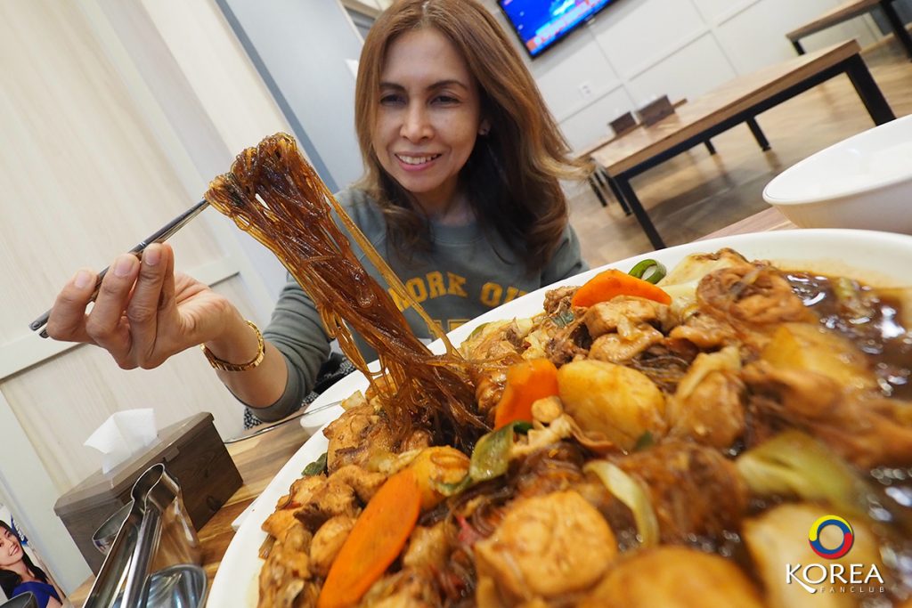 ชมกันเต็มๆ จิมดัก หรือ ไก่ผัดวุ้นเส้นซอสเกาหลี รสเผ็ด (เลือกระดับความเผ็ดได้) วัตถุดิบหลักๆ คือ ไก่ + วุ้นเส้นเกาหลี + มัน + แครอท + กะหล่ำปลี + ต้นหอมยักษ์ และ พริกเกาหลี