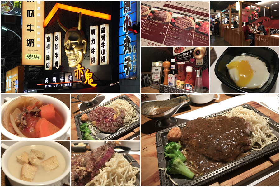 มื้อค่ำของวันนี้ ลุงเด้ง ป้าไก่มาจบที่ Steak Akaoni เป็นสเต็กในแบบไต้หวัน เสิร์ฟมาในจานร้อน ราคาไม่แพง เสิร์ฟพร้อมเส้น (Tapanyaki Noodle) / เกรวี่พริกไทยดำ หรือเกรวี่หัวหอม / ไข่ออนเซ็น หรือ ไข่ตุ๋น และซุปเดินไปตักเองได้ไม่จำกัด ราคาเริ่มต้นที่ ในภาพลุงเด้งสั่ง Rib eye Steak ราคา NT$ 290 เหรียญ ถ้าเป็นไก่ หรือ หมู ราคาเริ่มต้นที่ NT$ 260 เหรียญ เท่านั้น
