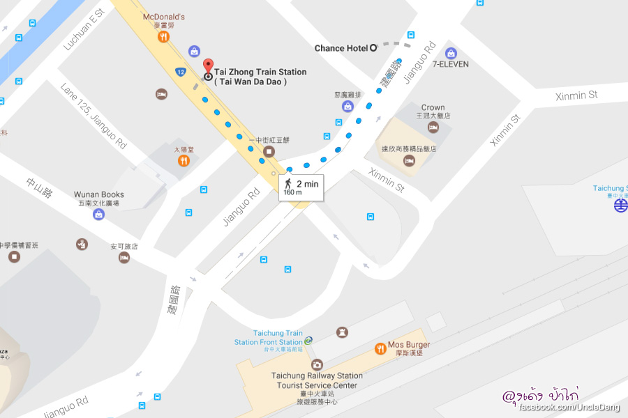 จาก HSR Taichung Station ลุงเด้ง ป้าไก่ นั่งรถเมล์สาย 82 ไปลงที่ Taichung Railway Station คืนนี้ลุงเด้งป้ไก่พักที่ Chance Hotel ซึ่งเดินจากจุดนี้เพียง 3 นาทีเท่านั้น