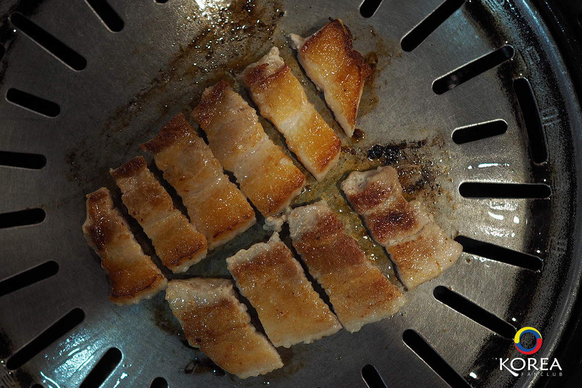ปิดท้ายมื้อด้วย หมูสามชั้นย่าง เน้นย่างแบบรีดไขมัน ตอนแรกใช้ไฟแรงๆ พอเริ่มสุก ผ่อนไฟ ค่อยๆ ให้ความร้อน ละลายไขมันไปเรื่อยๆ สุดท้ายจะได้ความกรุบกรอบนิดๆ