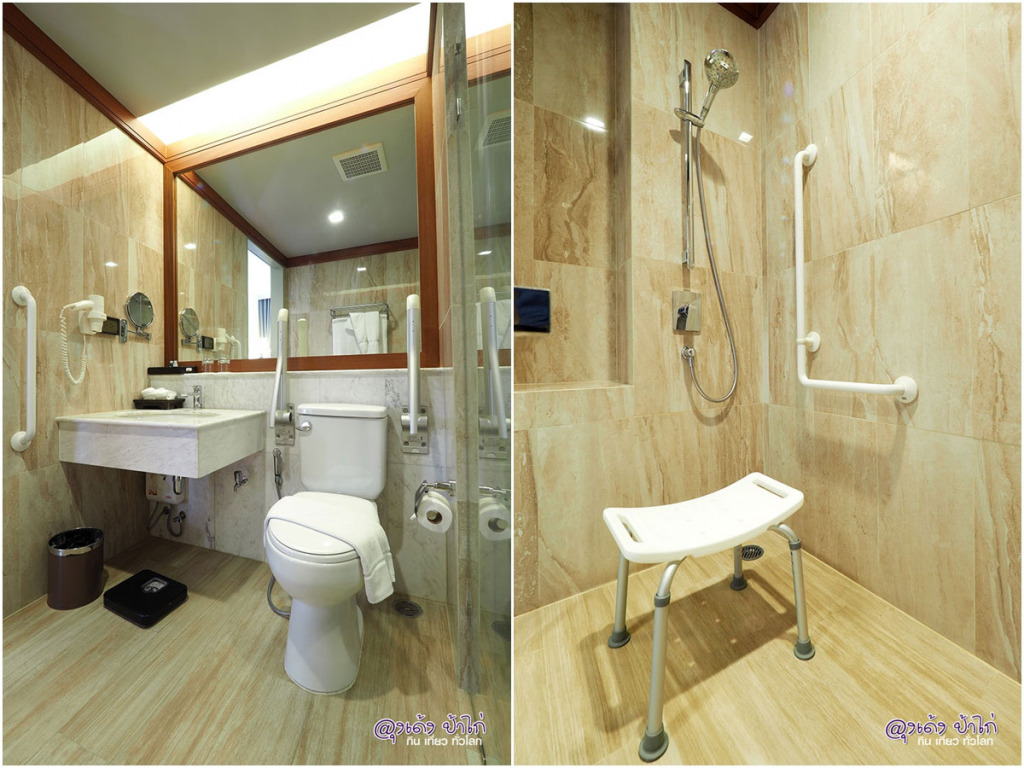 ห้องน้ำสำหรับ มนุษย์ล้อ ประตูห้องน้ำเป็นบานเลื่อน ขนาดใหญ่ รถเข็นเข้าได้สบายๆ ภายในมีอุปกรณ์เช่น แขนช่วยพยุง ราวจับ ตามจุดต่างๆ และเก้าอี้สำหรับนั่งอาบน้ำ