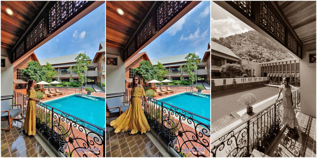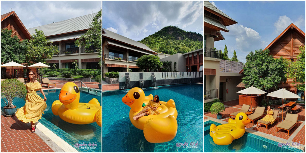 สระว่ายน้ำ ตั้งอยู่ใจกลางรีสอร์ท อาจจะดูเรียบง่าย แต่บอกเลยว่า มีมุมถ่ายรูปสวยๆ แอบซ่อนอยู่เยอะเลยนะ