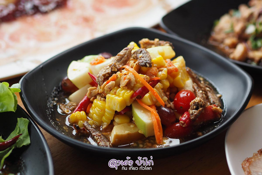 ตำผลไม้ มีทั้งแอ๊ปเปิ้ลแดง / เขียว มะเขือเทศ ข้าวโพดหวาน เครอท รสชาติหวานนำ ติดเปรี้ยวนิดๆ ถ้ากินกับแอ๊ปเปิ้ลเขียว ก็จะเพิ่มความเปรี้ยว / กินกับ แอ๊ปเปิ้ลแดง ก็จะติดหวานนิดๆ เสริมความกรุบกรอบด้วย ปลากรอบโรยงา เปรี้ยวๆ เค็มๆ หวานๆ อร่อยดี