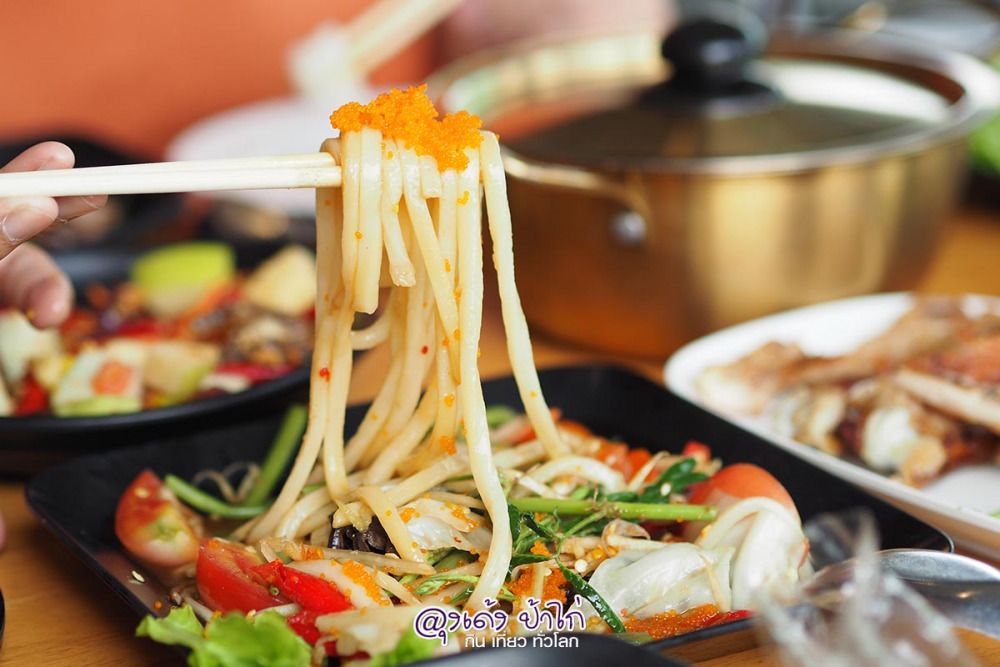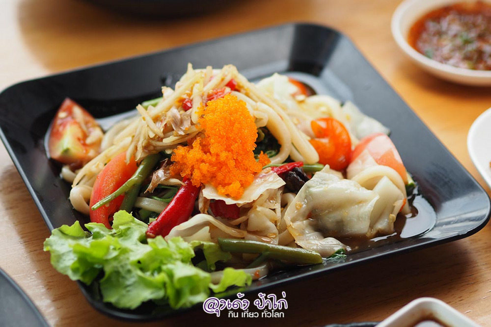 ยกมาเสิร์ฟที่โต๊ะ... เข้าใจล่ะ ส้มตำมะละกอผักกระเฉด + เส้นอุด้ง และ ไข่ปลาโทบิโกะ "ไข่ปลาบิน" เพิ่มความเป็นญี่ปุ่น จึงเป็นที่มาของ ตำบั้งไฟชินคันเซ็น - OK OK สร้างสรรค์ดี จากขนมจีน เป็นเส้นอุด้ง ก็หนึบๆ หนับๆ ดี 555