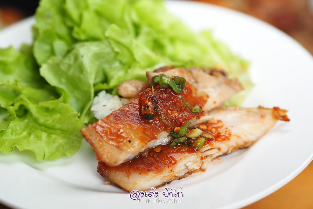 เมนูขายดีที่สุด สั่งกันทุกโต๊ะ ป้าแก้ว เลือกใช้สะโพกไก่ เลาะกระดูก แล้วแล่เป็นแผ่นใหญ่ หมักด้วยเครื่องปรุงสูตรพิเศษ แล้วนำมาย่างด้วยไฟอ่อนๆ ใจเย็นๆ ย่างจนหนังแห้งกรอบอร่อย แต่เนื้อไก่ยังนุ่มเคี้ยวอร่อยกินง่าย