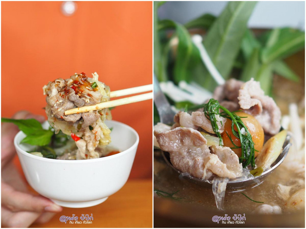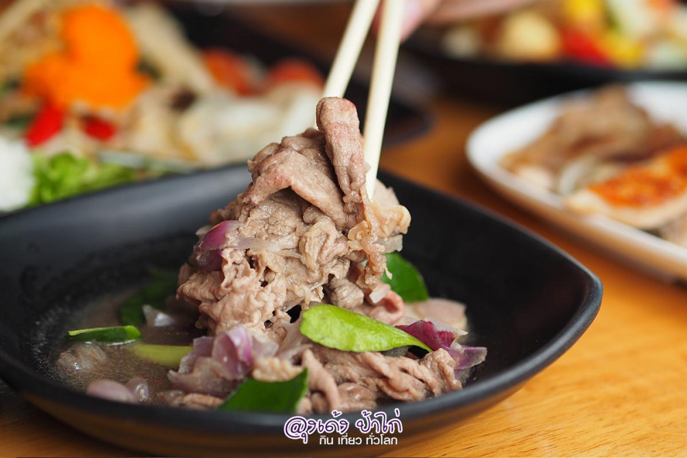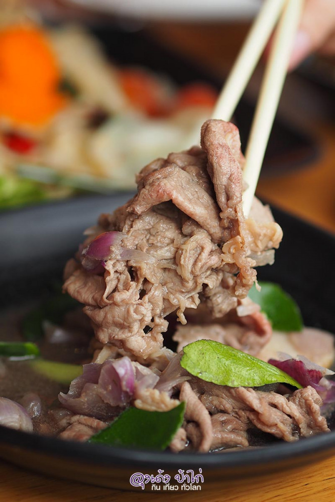 เนื้อสไลซ์บางแบบชาบู ลวกในน้ำซุปสมุนไพร - เป็นเมนูยกระดับจากอีสานพื้นบ้าน สู่ระดับสากลได้เลย เนื้อนุ่มมาก ลวกแบบ Medium นุ่มอร่อย กินกับน้ำจิ้มที่เสิร์ฟมาคู่กับ อร่อยเลย