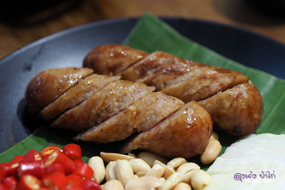 ไส้กรอกอีสาน : สูตรเด็ดของทางร้าน เป็นอีก 1 เมนูที่ขายดี เสิร์ฟพร้อมเครื่องเคียง ถั่วลิสง พริกสด ผักแนม