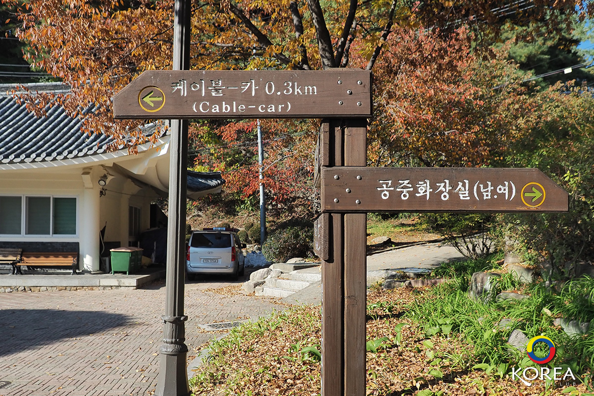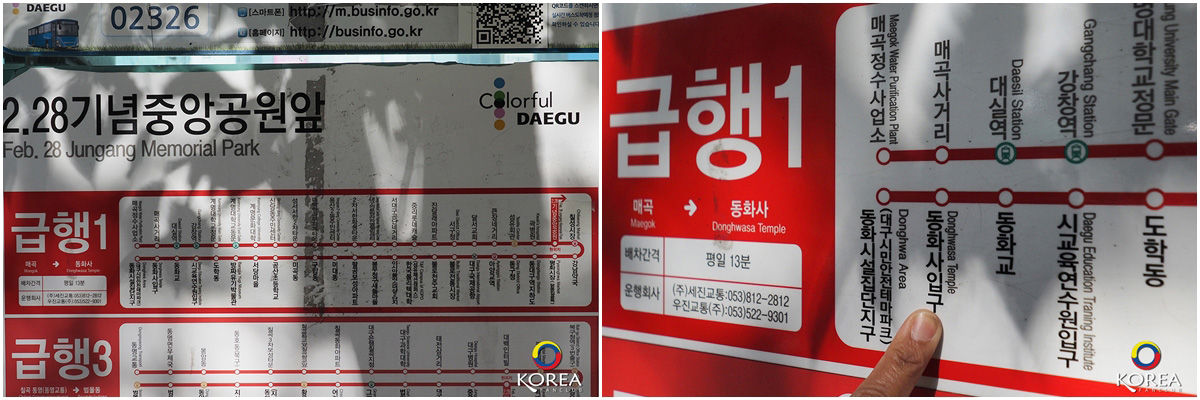 การเดินทาง : รถเมล์ Express Bus หมายเลข 1 ( 급행 ) ขึ้นที่ป้าย 2.28 Central Memorial Park (ตามในแผนที่) เริ่มต้นที่ ป้าย 2.28 Central Memorial Park ลงสถานีปลายทาง Donghwa Area แต่... เราต้องเดินขึ้นเนินตลอดทาง (อาจจะหมดแรงซะก่อน) ลุงเด้งป้าไก่ เลือกลงสถานี Donghwasa Temple จากนั้นเดินอีก 10 นาทีก็ถึงทางขึ้นกระเช้า