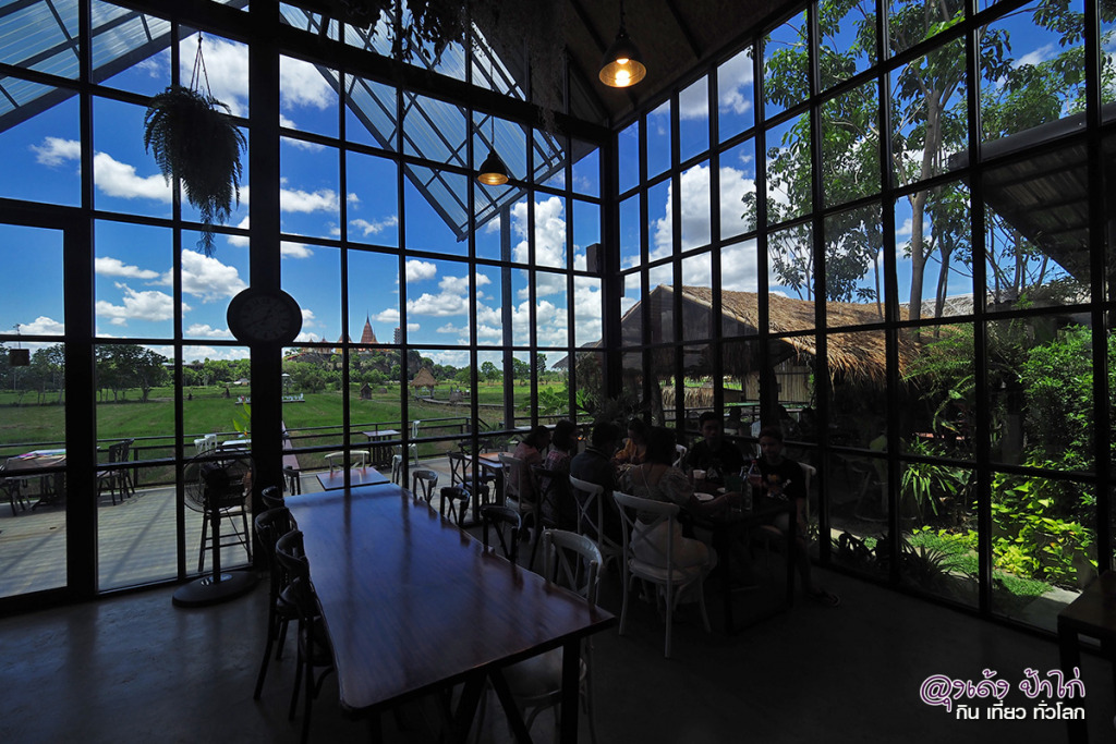 บรรยากาศภายในร้าน : จัดแต่งสไตล์ Glass House เรือนกระจก – ถ้าเรามาช่วงบ่าย ก็จะถ่ายภาพได้แบบนี้เลยครับ ถ่ายภาพจากในตัวอาคารก็สวย ออกไปด้านนอก ถ่ายวิวก็สวย