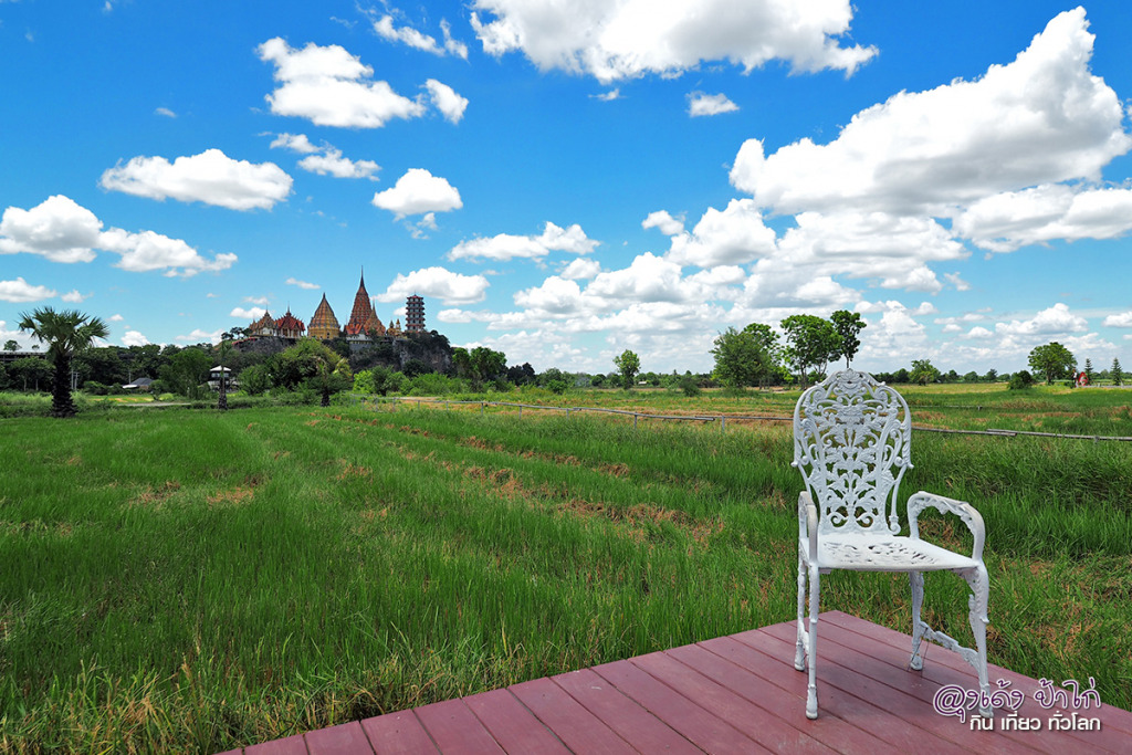 นี่ครับ... มุมถ่ายรูป เด็ดที่สุดของร้าน บันไดสวรรค์ กลางทุ่งนา โดยมี วัดถ้ำเสือ กาญจนบุรี