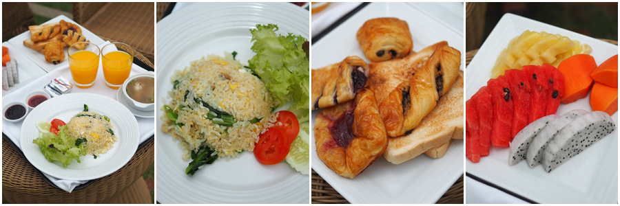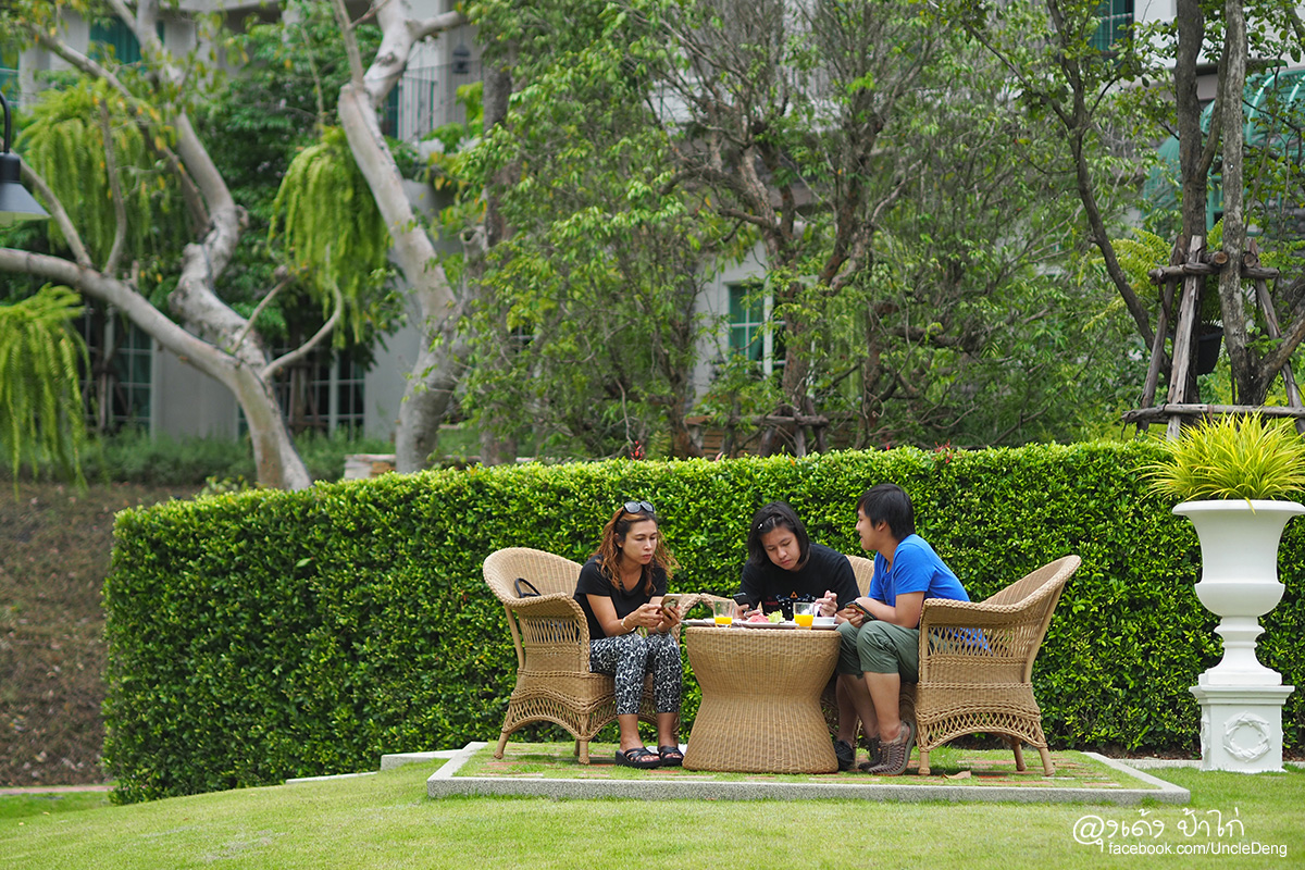 เช้าวันสุดท้าย ลูกชาย2 คน ตื่นสาย... เราเลือกโปรแกรม Breakfast Whenever/Wherever ความหมายคือไม่ว่าเราจะสายซักกี่โมงก็มีบริการอาหารเช้า เช่นถ้าเราตื่นเช้าก็กินอาหารเช้าที่ห้องอาหารแบบปกติ แต่หากเราตื่นสาย (เที่ยงวัน) ก็โทรแจ้งให้โรงแรมจัดอาหารเช้ามาบริการที่ห้องพัก ริมสระว่ายน้ำ หรือที่ใดก็ได้ภายในโรงแรม โดยมีเมนูอาหารเช้าให้เลือก 5 แบบ เช้านี้...เราเลือกกินอาหารเช้าในสวนกันครับ