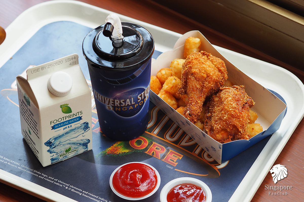ขายดีอันดับหนึ่งสำหรับเด็กๆ Kid's Meal Dino Nuggets with Fries ราคา SG$ 14.00 เหรียญ (แถมน้ำดื่ม 1 ขวด) เสิร์ฟ มาในกล่องพลาสติก มี LOGO Universal Studios Singapore เป็นของที่ระลึก นำกลับบ้านได้เลย