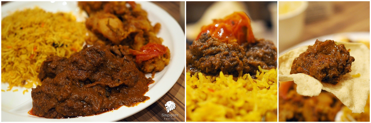 อาหารที่ร้านนี้จะเน้นเป็นชุด คือ อาหารจานหลัก + น้ำดื่ม ราคา 16 เหรียญ เป็นอาหารมุสลิม เมนูขายดีที่สุดคือ Dry Curry Chicken Combo และ Fish Curry Combo