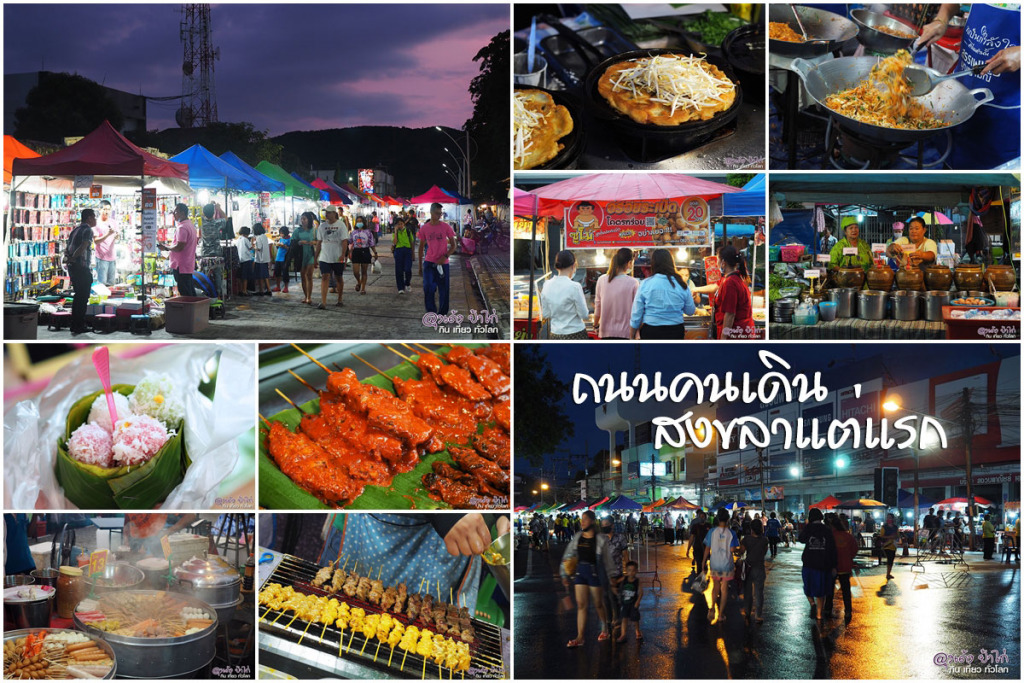 ถนนคนเดิน สงขลาแต่แรก : ที่กิน - เดินช้อป เปิด ทุกวันศุกร์ เสาร์ ตั้งแต่ 17.00 - 22.00 ถนนจะนะ ท่ามกลางบรรยากาศเมืองเก่า กำแพงเมือง โซนด้านหน้า เป็นศูนย์รวมของกิน ถัดมาด้านกำแพงเมืองสินค้าแฮนด์เมด ของใช้ต่างๆ หลากหลายสไตล์ แต่โดยรวมคือ... ของกินเยอะมาก
