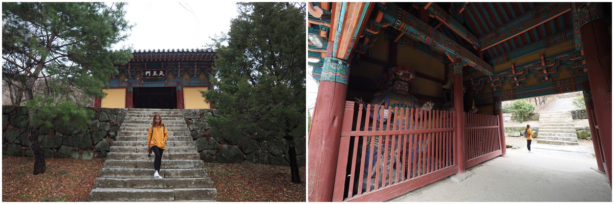ประตูทางเข้า Cheonwangmun Gate หรือ The Heavenly King Gate เป็นที่ประทับของ ท้าวจตุโลกบาลทั้งสี่ เทวดาที่รักษาทุกข์ สุข ของมนุษย์โลกไว้ทั้ง 4 ทิศ และทำหน้าที่ป้องกันอันตรายที่จะเกิดแก่มนุษย์โลกทั้งหลาย