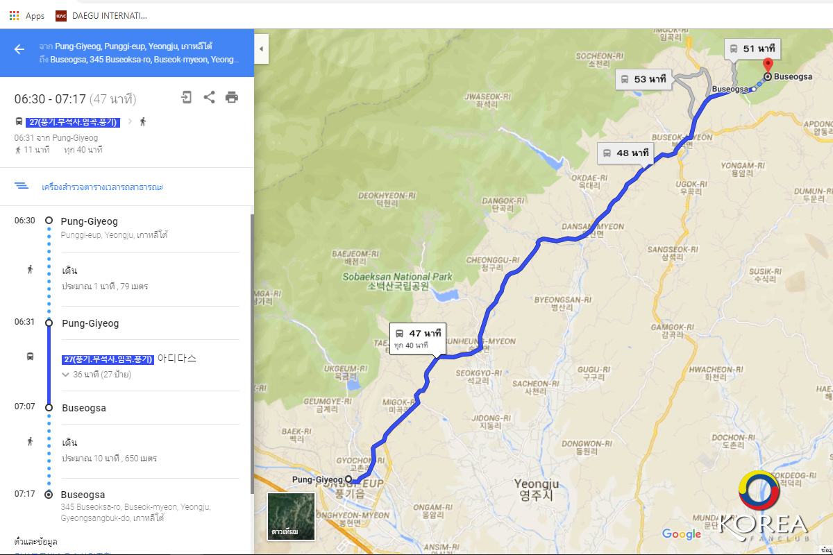 การเดินทางจาก ป้ายรถเมล์ ไปถึง วัดบูซอคซา (Buseoksa Temple) ใช้เวลาประมาณ 1 ชั่วโมง คลิก https://goo.gl/maps/2y85V2Z2hJn