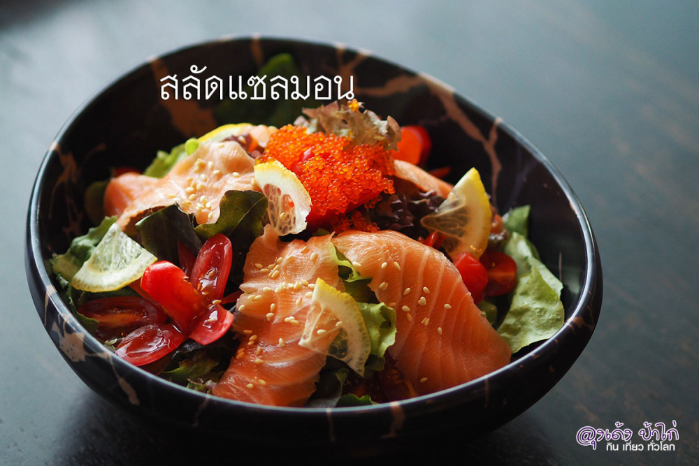 เมนูปิดท้าย สั่งง่ายๆ กินง่ายๆ สลัดแซลมอน 249.- เสิร์ฟมาในชาม มีทั้งผักสด มะเขือสด Topping ด้วย แซลมอนสด ไข่กุ้ง พร้อมน้ำสลัด สูตรของ วาซาบิ 789