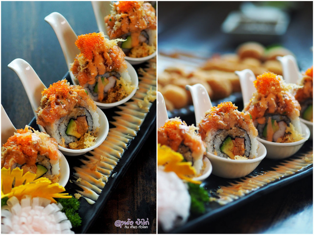 เมนูนี้บอกเลยว่าคุ้มมาก... แซลมอนสไปซี่โรล 250.- โรลชิ้นโตๆ เสิร์ฟมา 5 คำยักษ์ เรียกว่า คำเดียวกินไม่หมด มีทั้ง อาโวคาโด ปูอัด Topping ด้วย แซลมอล ไข่กุ้ง เพิ่มความกรุบกรอบด้วยแป้งทอดเทมปุระ กับซอสสูตรพิเศษของทางร้าน