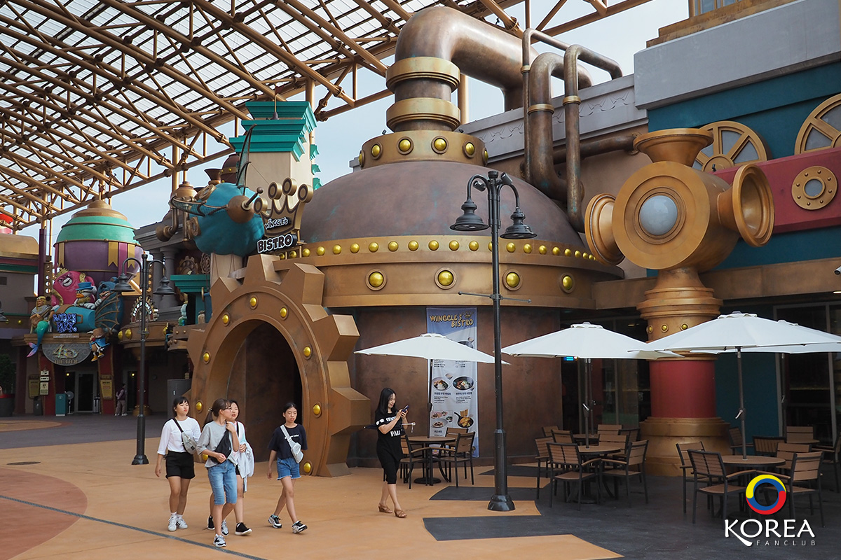 ศิลปะแบบ Steampunk นำเสนอเทคโนโลยี แบบวินเทจ เช่น เครื่องบิน เครื่องจักรไอน้ำ หุ่นยนต์ ฟันเฟือง โทนสีทองหม่นๆ ออกน้ำตาล เหมือนทองเหลืองที่มีความเก่าแบบวินเทจ หรือสีสนิม ถนนเส้นหลักแห่งนี้ จะเป็นร้านขายของที่ระลึก และตู้เกมต่างๆ