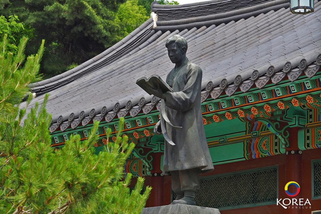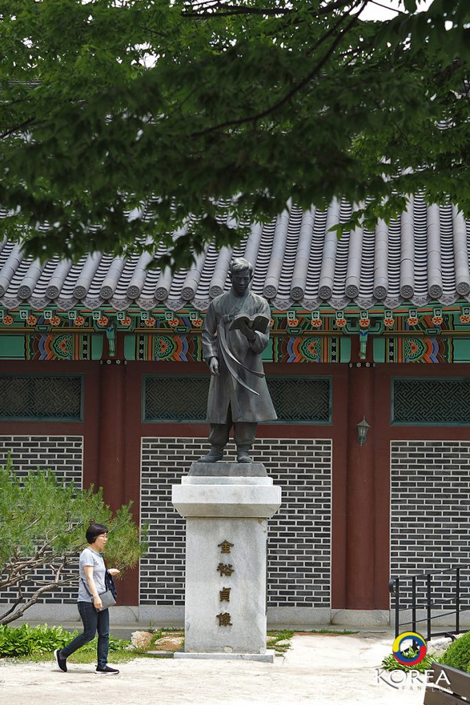 ภายในหมู่บ้านวรรณกรรม เราจะเห็นรูปหล่อโลหะของ คิม ยู จอง ตั้งเด่นเป็นสง่า อยู่ด้านข้างอาคารพิพิธภัณฑ์