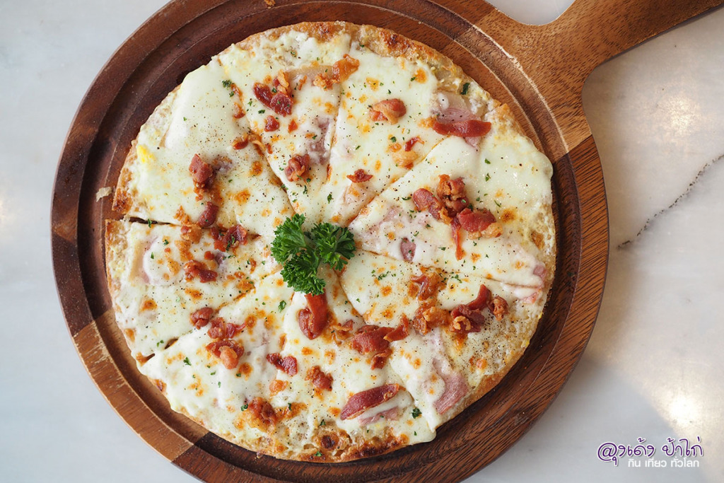 เบบี้พิซซ่า คาร์โบนาร่า "Carbonara" Baby Crusty Pizza เสิร์ฟมาบนถาดไม้ ชิ้นไม่ใหญ่