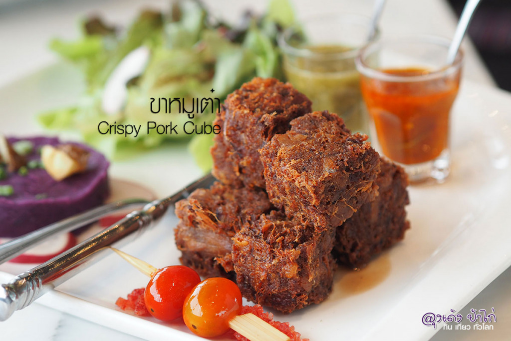 ขาหมูเต๋า - เนื้อขาหมู ฉีกเป็นเส้นๆ ปั้นเป็นก้อน 4 เหลี่ม ทอดกรอบ กับน้ำจิ้มรสเด็ด เฮ้ย... อร่อยอ่ะ จานนี้ในเมนู 420.- เป็นเมนูที่สร้างสรรค์ และ กินง่ายขึ้นมาก ด้านนอกกรุบกรอบ ด้านในนุ่มฉ่ำ กินกับน้ำจิ้มสามรส อร่อยเลยล่ะ