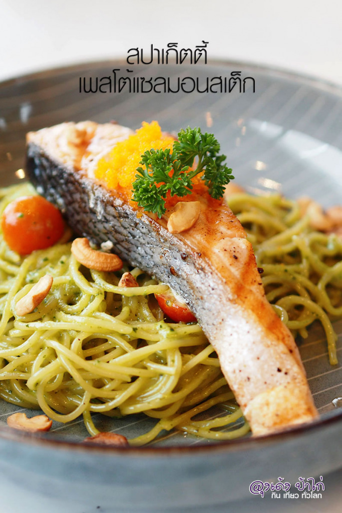 สปาเก็ตตี้เพสโต้แซลมอนสเต็ก - แซลมอนชิ้นสวย ย่างไฟสุกกำลังดี เสิร์ฟพร้อมกับ สปาเก็ตตี้เพสโต้ “ซอสเพสโต” หอมใบโหระพา หอมน้ำมันมะกอก ปรุงรสด้วย เกลือป่น เพิ่มความหอมด้วยชีส คลุกเคล้ากับเส้นพาสต้า จานนี้ 290.-
