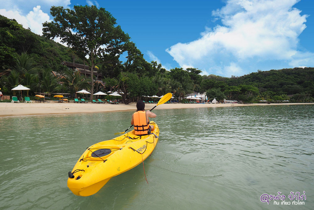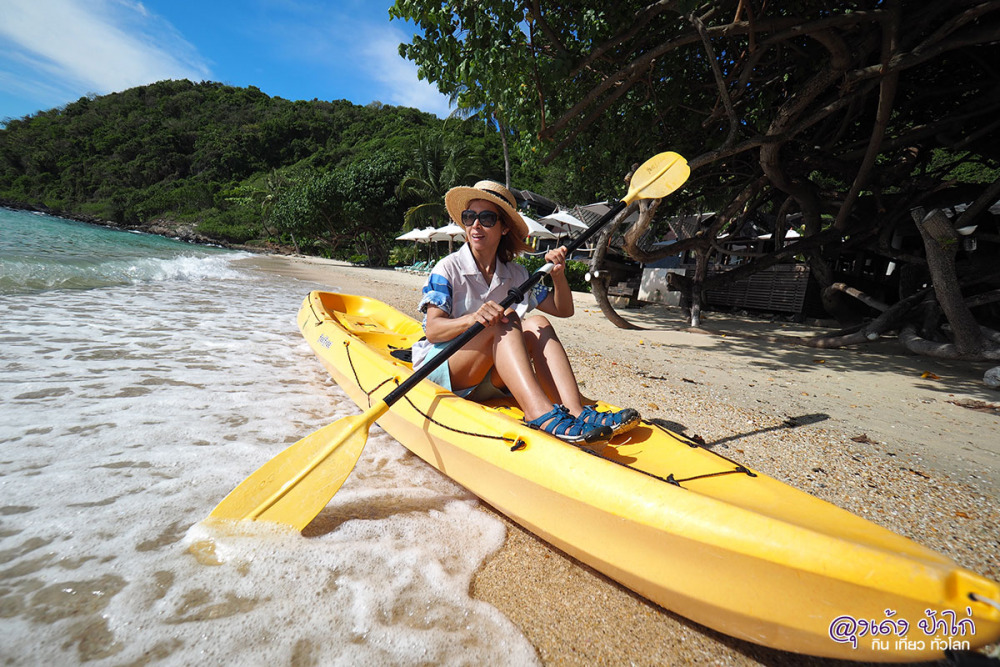 อ่าวพร้าว รีสอร์ทกิจกรรมพายเรือ ติดต่อเจ้าหน้าที่ดูแล บริเวณชายหาดได้เลย ภาพนี้ป้าไก่ มานั่งถ่ายรูปสวยๆ แค่นั้นนะครับ  ถ้าพายจริงๆ ต้องสวมเสื้อชูชีพ ทุกคน