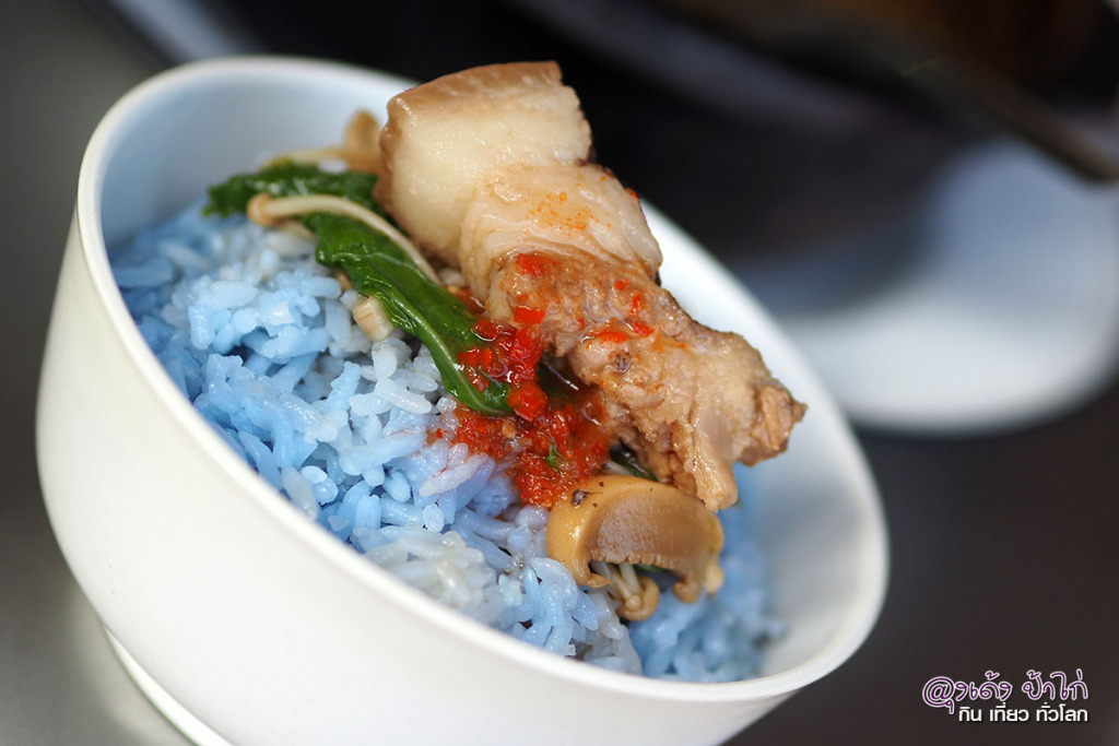 ลุงเด้งป้าไก่ สั่งมากินกับ ข้าวสวยๆ ถ้วยละ 10 บาท เป็นข้าวหุงกับน้ำอัญชัญ สีม่วงสวยเชียว