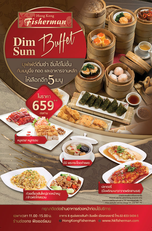 ใครสายบุฟเฟ่ต์ ร้าน ฮ่องกง ฟิชเชอร์แมน ยังมีบริการ ติ่มซำบุฟเฟ่ต์อร่อยจุใจกับติ่มซำสไตล์ฮ่องกง กว่า 40 รายการ ให้บริการทุกวัน เวลา 11.00 – 15.00 น. ผู้ใหญ่ราคาท่านล่ะ 659 ++ (เด็กความสูงไม่เกิน 110 ซ.ม) จะคิดครึ่งราคา