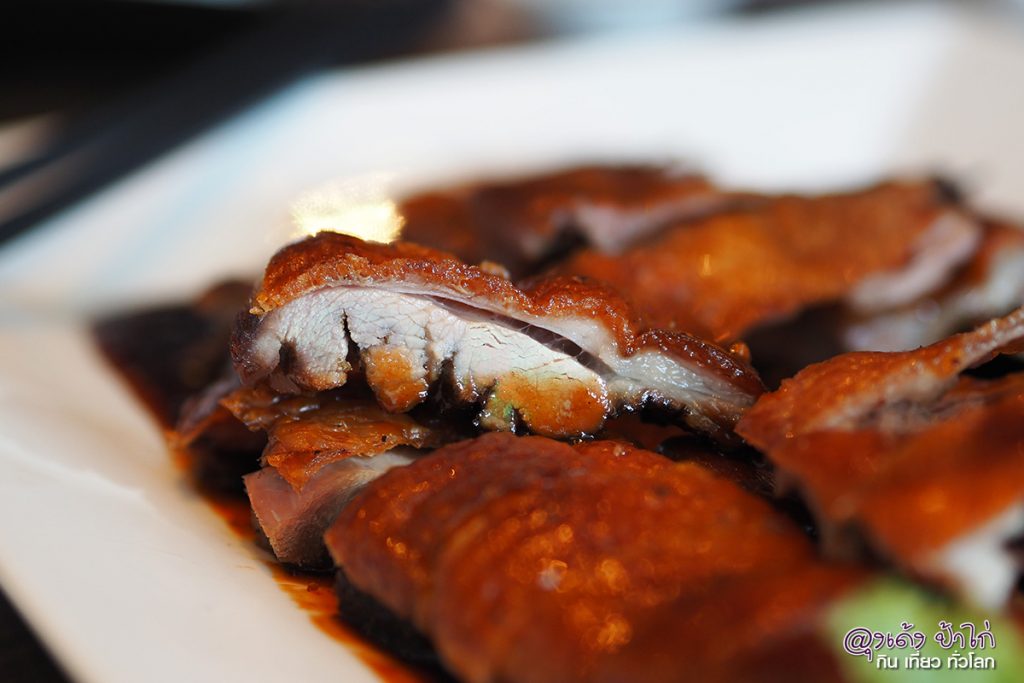เป็ดอบชาเขียว ... หนังกรอบ ไขมันถูกรีดออกจนเกือบหมด สาวๆ กินได้เลยไม่ต้องกลัวอ้วน เนื้อเป็ดไม่นุ่มเหมือนเป็ดย่างนะ เพราะนี่คือเป็ดอบชาเขียว เนื้อเป็ดอบจะมีความแห้งกว่าเป็ดย่าง กินกับซอสบ๊วยที่มีส่วนผสมของเครื่องเทศอีกหลากหลายชนิด