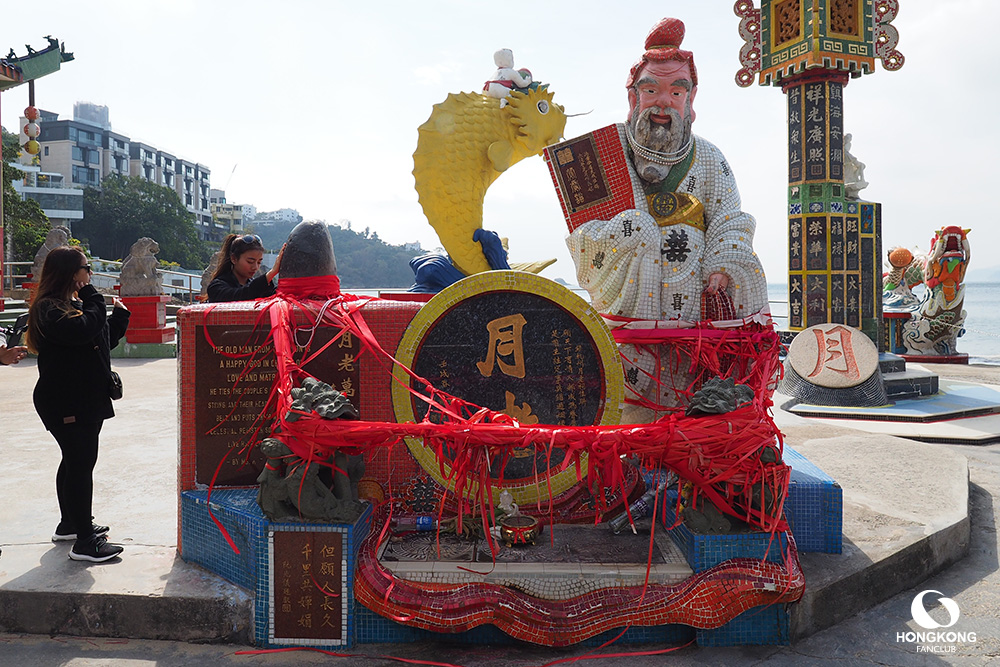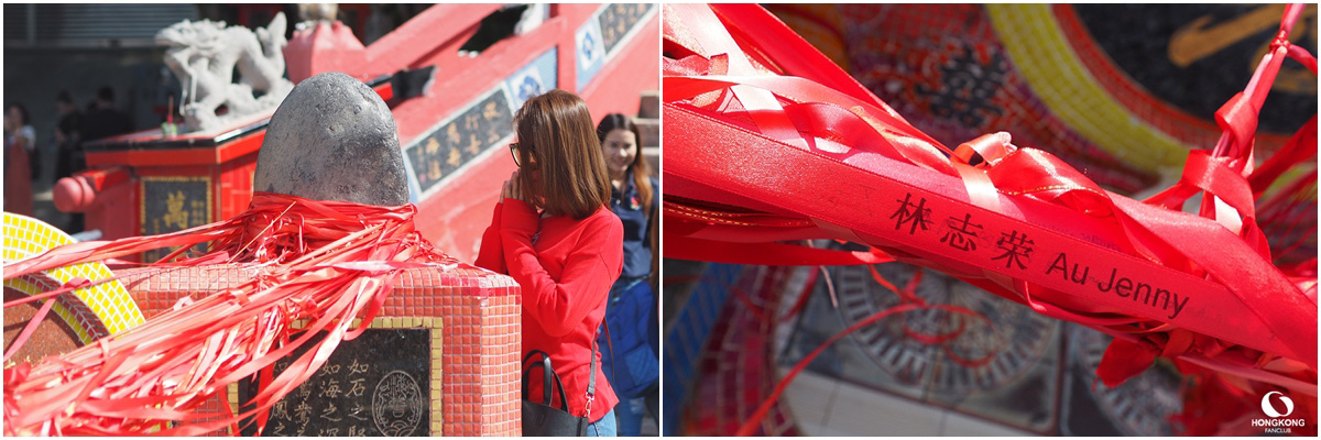 แอบรักเค้าข้างเดียว : นำ ริบบิ้นสีแดง ยาว 12 เมตรขึ้นไป เขียนชื่อ “คนทีเราแอบชอบ” อธิษฐานกับเทพจันทรา ว่า “ถ้าคนนี้เป็นคู่เรา ก็ขอให้เราสมหวัง” พันริบบิ้นรอบ เทพจันทรา หินศักดิ์สิทธิ์ และปี่เซี๊ยะ ตามในภาพ
