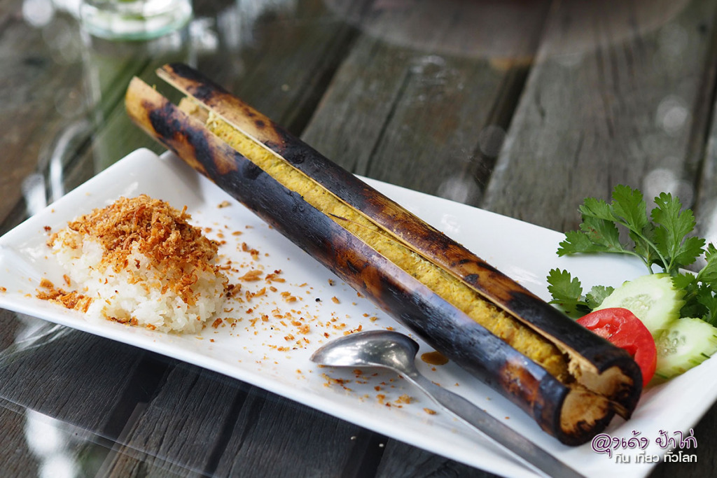 ไก่กระบอก คือ ไก่สับผสมเครื่องแกงคล้ายๆ ห่อหมก ใส่ในกระบอกไม้ไผ่ แล้วนำไปอบด้วยฟืน เสิร์ฟพร้อมข้าวเหนียว โดยด้วย หอมเจียว ชุดนี้ราคา 195 บาท