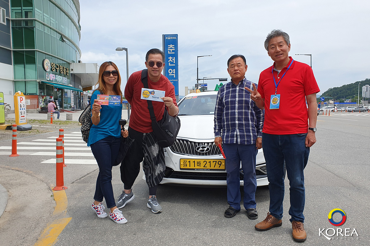 เที่ยวชุนชอน สะดวกที่สุด ลุงเด้งป้าไก่ ใช้บริการ Tourist Taxi สำหรับนักท่องเที่ยวต่างชาติ เป็นหน่วยงานของภาครัฐ ราคาไม่แพง บริการดี และสะดวกสบายทีสุด ค่าใช้จ่าย 50,000 วอน / Taxi 1 คัน สำหรับ 3 ชั่วโมงแรก (ภาครัฐออกให้ 30,000 วอน นักท่องเที่ยวจ่ายเอง 20,000 วอน) เมืองชุนชอนนี้ เป็นเมืองอยู่ทางภาคตะวันออกเฉียงเหนือของกรุงโซล