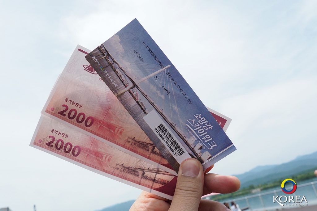 สะพานกระจกใส แห่งนี้ ยาวที่สุดในเกาหลีใต้ มีค่าเข้าชม หรือ ค่าเดินเล่น คนละ 2,000 วอน ซึ่งก็ถูกมาก ประมาณ 60 บาทเท่านั้น แต่... เงินที่เราเสียไป เราจะได้คูปอง มูลค่า 2000 วอน กลับมาไว้ซื้อ ขนม นม เนย หรือ น้ำดื่มได้ ... มองอีกมุมคือ ไม่เสียค่าใช้จ่ายนั้นแหละ 555