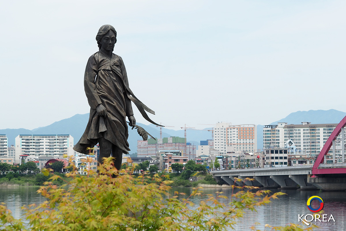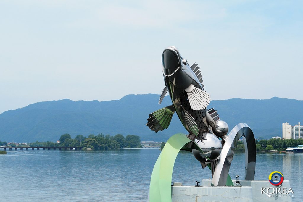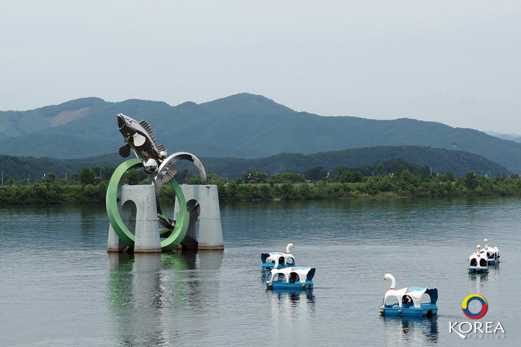 รูปปั้นหญิงสาว Soyang gang Virgin Girl สัญลักษ์ของทะเลสาบแห่งนี้ ได้รับรงบันดาลใจจากเพลงพื่นบ้านของเกาหลี ที่มีเนื้อหาเกี่ยวกับเด็กสาวที่อาศัยอยู่ในหมู่บ้านนี้ มายืนรอคนรักที่จากเธอไป The statue is based on the song “Soyanggang Cheonyeo,”