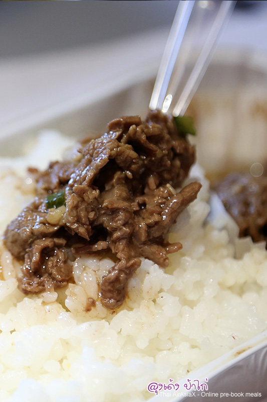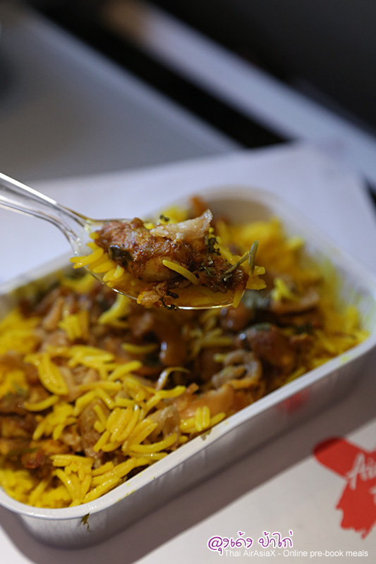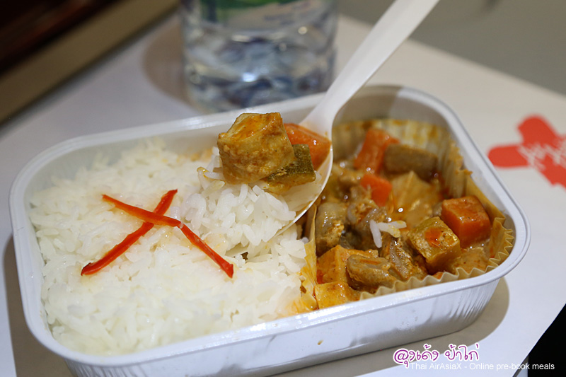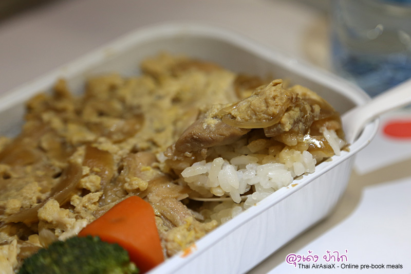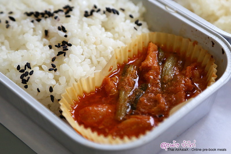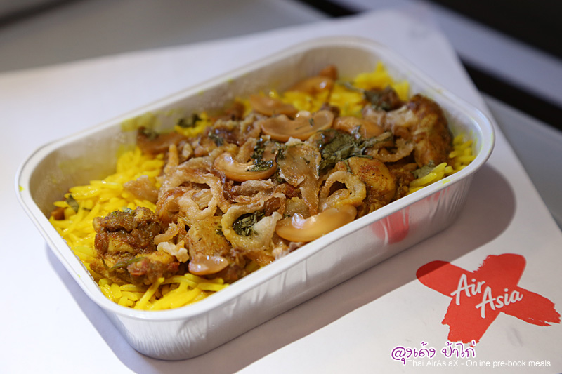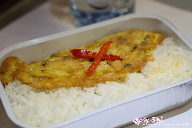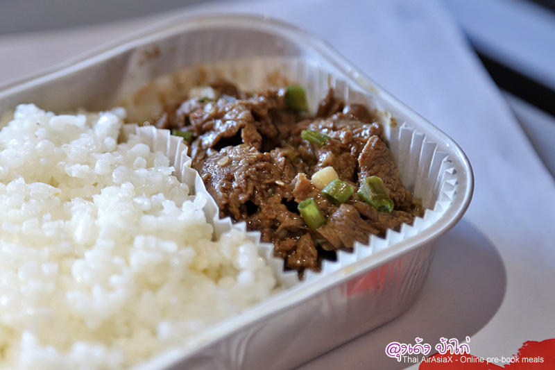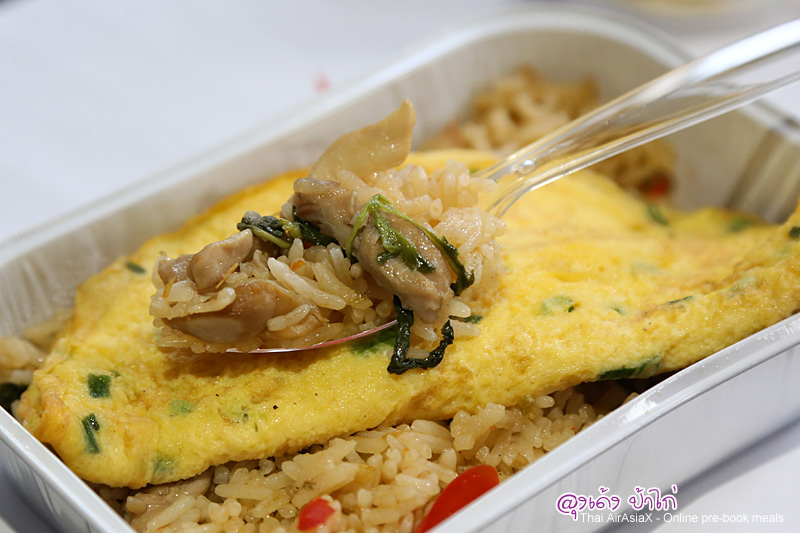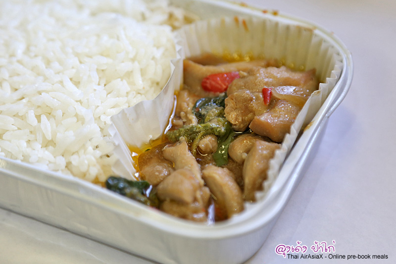 ข้าวผัดกะเพราไก่ไข่เจียว : ข้าวหอมมะลิคลุกกระเพรารไก่สจัดจ้านสไตล์ไทยแท้ๆ ด้านบนมีไข่เจียวนุ่มๆ เปิดกล้องออกมา กลิ่นหอมคลุ้งไปทั่วเลยครับ กลิ่นหอมๆ ของอาหารนี่เรียกน้ำย่อยผู้โดยสารที่นั่งข้างๆ ดีแท้ คงเป็นกลยุทธ์ในการขายของ Thai AirAsia X ชัวร์ 100% ใครได้กลิ่นเป็นต้องอยากชิม