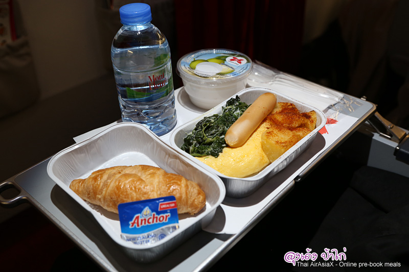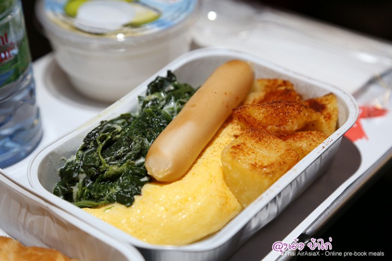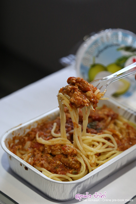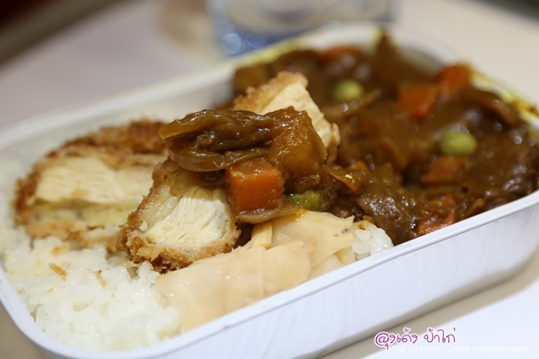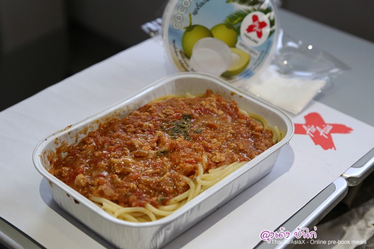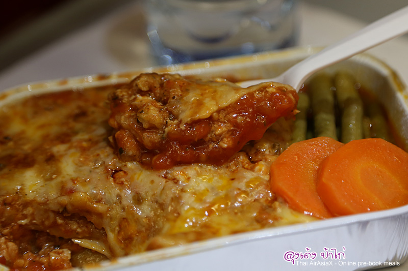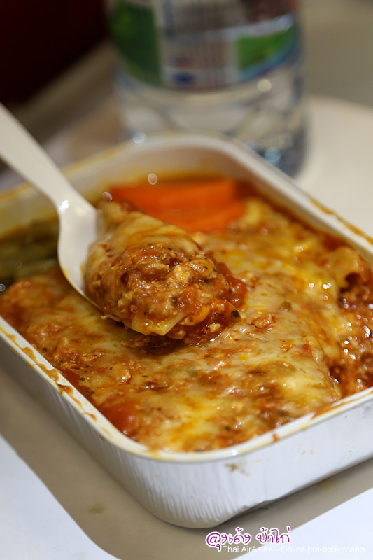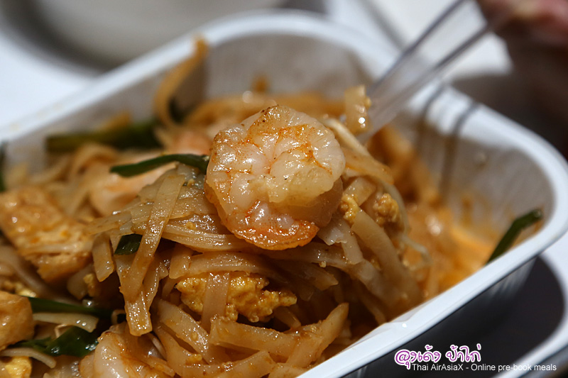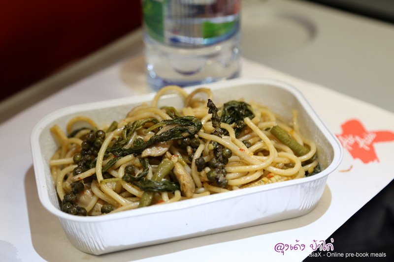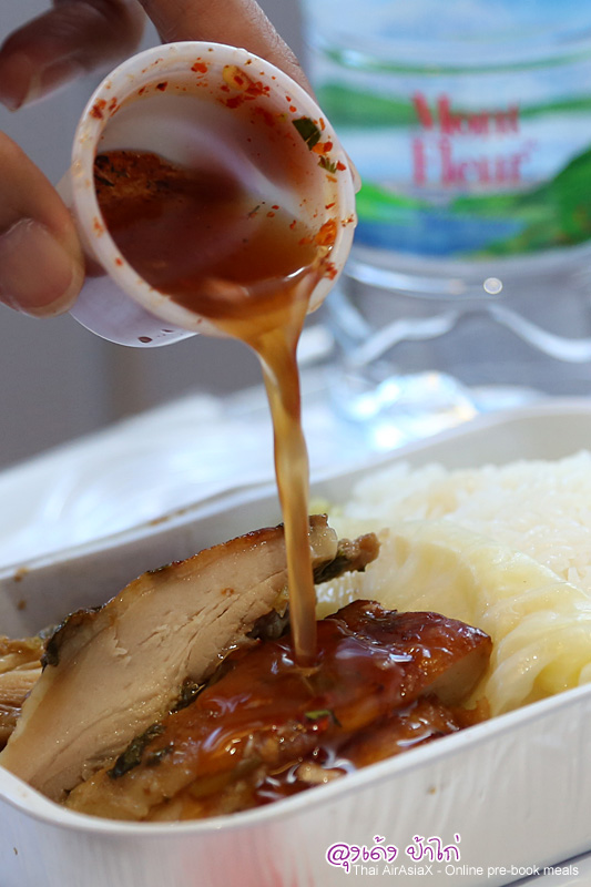 ข้าวผัดกะเพราไก่ไข่เจียว : ข้าวหอมมะลิคลุกกระเพรารไก่สจัดจ้านสไตล์ไทยแท้ๆ ด้านบนมีไข่เจียวนุ่มๆ เปิดกล้องออกมา กลิ่นหอมคลุ้งไปทั่วเลยครับ กลิ่นหอมๆ ของอาหารนี่เรียกน้ำย่อยผู้โดยสารที่นั่งข้างๆ ดีแท้ คงเป็นกลยุทธ์ในการขายของ Thai AirAsia X ชัวร์ 100% ใครได้กลิ่นเป็นต้องอยากชิม