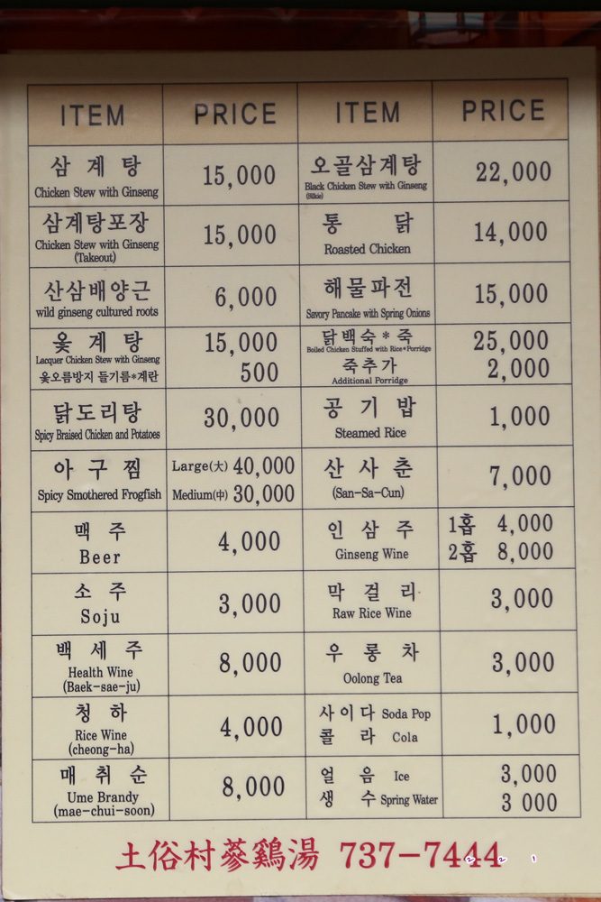 ราคาเริ่มต้นที่ หม้อละ 15,000 วอน / ไก่ดำตุ๋นโสม 22,000 วอน / ไก่ย่าง 14,000 วอน